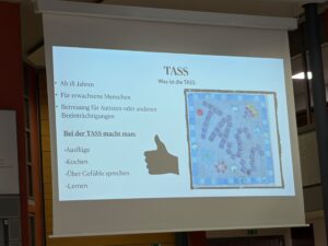Ein weiteres Highlight war der Besuch der Ulrichswerkstätten, wo die Schülerinnen und Schüler die Arbeitswelt von Menschen mit Beeinträchtigungenn kennenlernen durften, sowie der Austausch mit Schülerinnen und Schülern der Elisabethschule. Trotz der temporären Verlagerung dieser Schule nach Friedberg war der Austausch bereichernd und inspirierend. Ebenso beeindruckt waren die Teilnehmenden von dem Besuch der TASS.